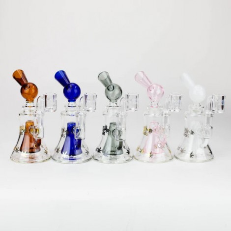 This 5.7" MGM Glass 2-in-1 bubbler is crafted from top-grade Borosilicate glass, this 5.7" bubbler boasts a 70 mm base, stemless design, and bent neck. Both its Thick bowl, and quartz banger are compatible with 14 mm female joints. Imprinted on each bong are leafs and a large "MGM" logo